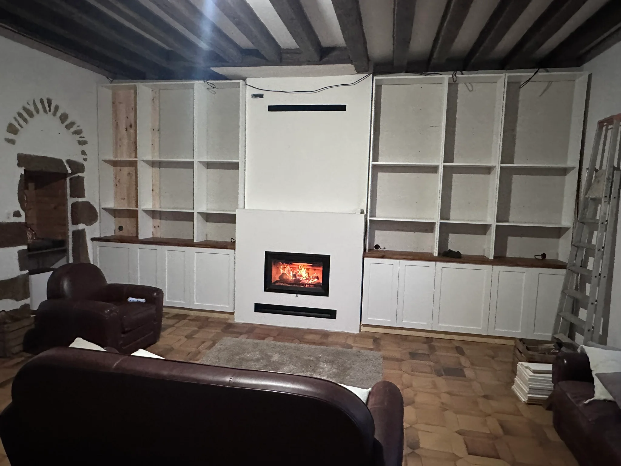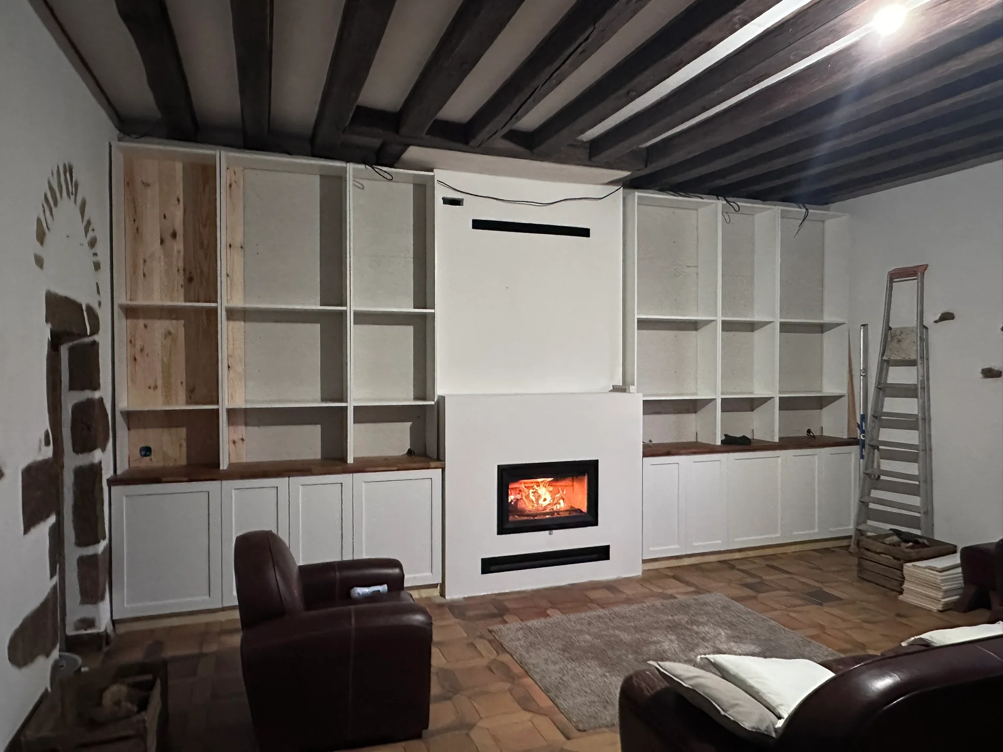 Ce projet illustre comment la modification d’une cheminée existante, associée à une bibliothèque sur mesure, peut métamorphoser un salon. L’habillage modernisé du foyer devient le point focal de la pièce, tandis que les rangements intégrés optimisent l’espace avec élégance.